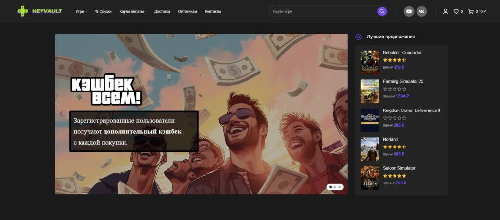 - Новости и события как стиль жизни: Раздел «Новости и акции» на главной — это не просто раздел, это пульс магазина. KeyVault позиционирует себя как живой организм, который всегда в курсе событий. Они не просто продают игры, они живут ими. Это создаёт ощущение комьюнити, которого так не хватает бездушным маркетплейсам.